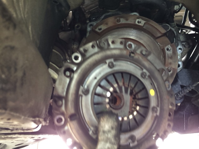 これが困り者。レバーがあたるとレリーズベアリングが外れちゃうんです。しょうがないので、ある程度までミッションを持ち上げて、その隙間からベアリングを規定の位置に戻してドッキングすることに。