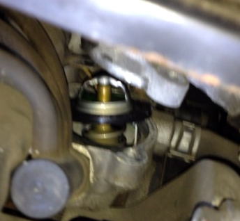 こちらは助手席側から見た図。サーモスタットのハウジングは10mmのネジ2本で止まっています
