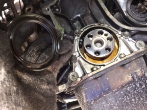 以前オイル漏れの修理依頼をもらったんですが、予想に反してなかなか深いところからオイルが漏れてきていました。それはオイルポンプの部分。いわゆるフロントカバーと呼ばれる場所です。