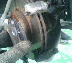 古いブレーキパッドをマイナスドライバーなどでこじって取り外します
