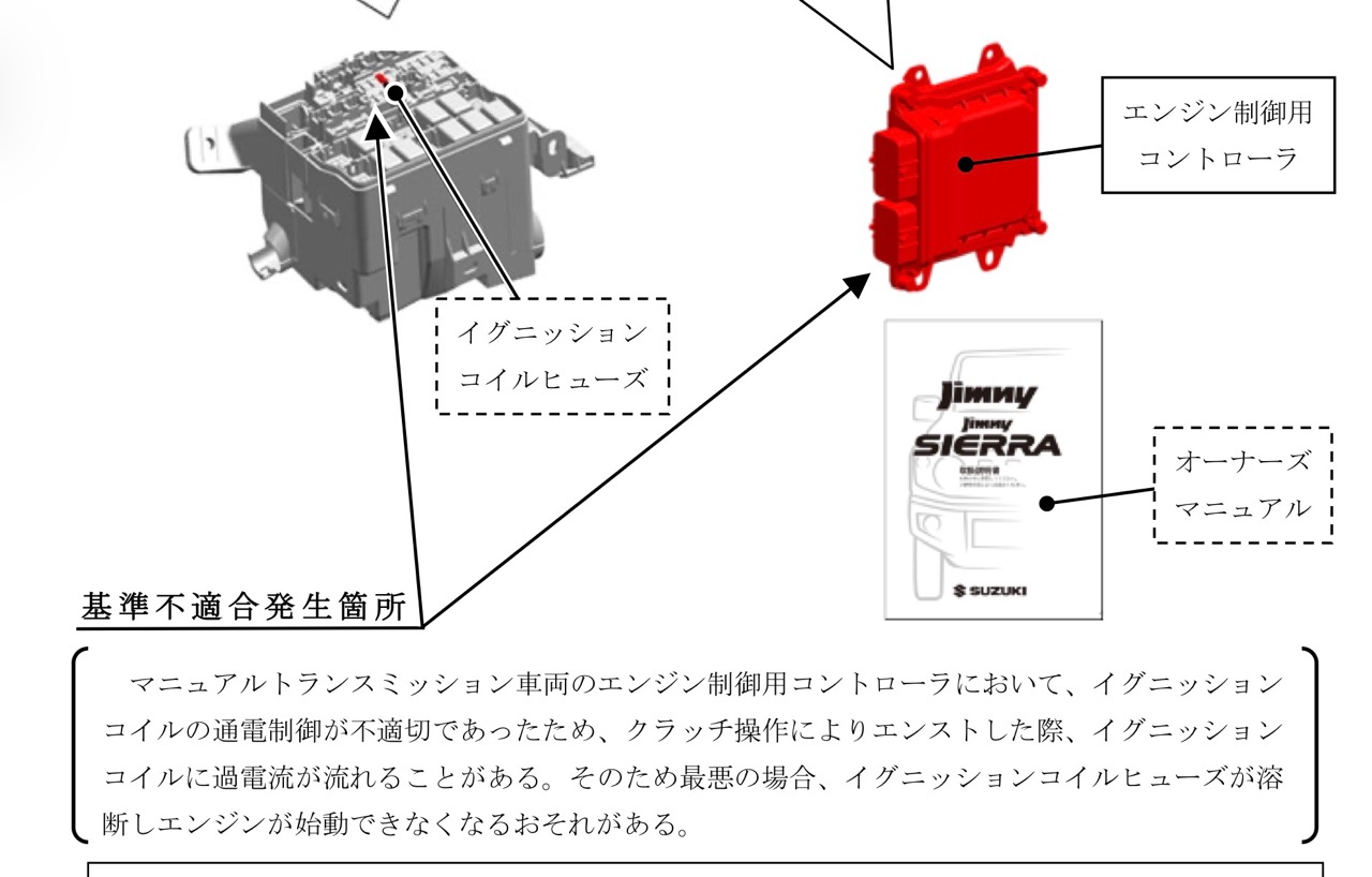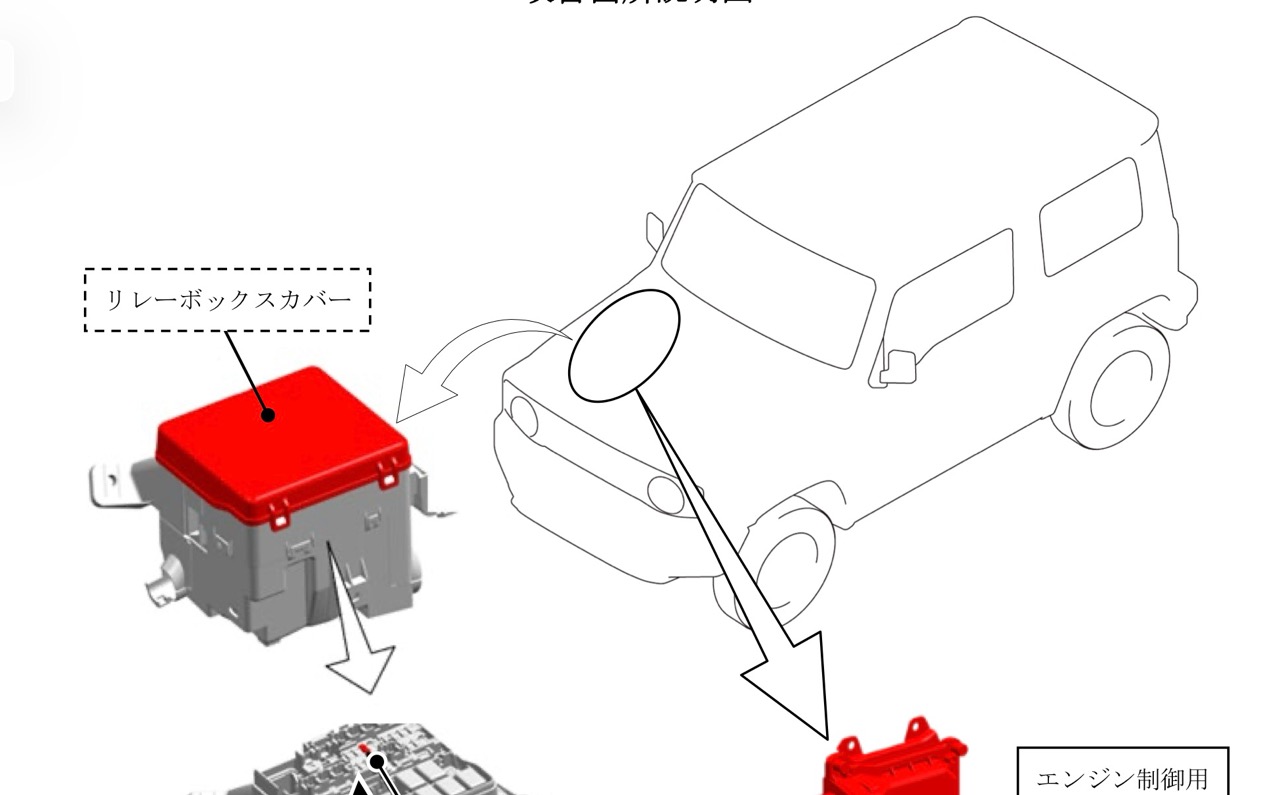 エンジン制御用コントローラの制御プログラムを対策ソフトウェアに 書き換え、イグニッションコイルヒューズ、リレーボックスカバー、オーナーズ マニュアルを対策品と交換する。