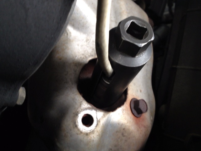 O2センサーの配線をソケットの切込みから出して、あとは12,7角のスピンナーで回すだけ。