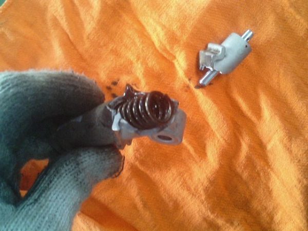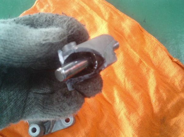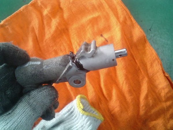 こちらがタイミングベルトのオートテンショナです。結構高い部品で、車によっては数万円するケースもあります。