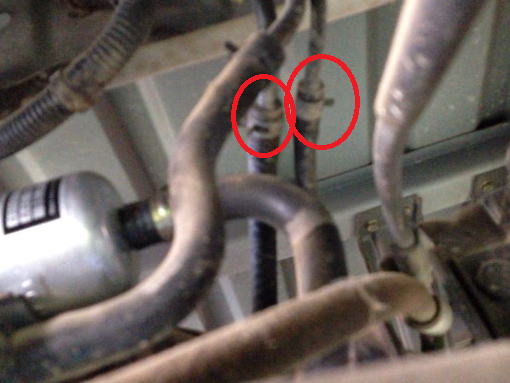 車両前方の上部にある燃料の給油口のエア抜きホースを切り離す。